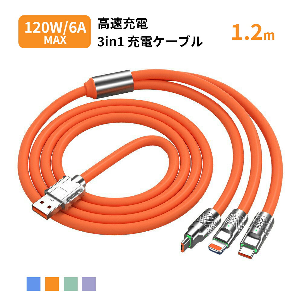 | 商品名 | 3in1 スマホ充電ケーブル 120W/6A高速充電 iphone/type-C/androidマルチ充電 480Mbps高速データ通信(Type-C) 1.2m |